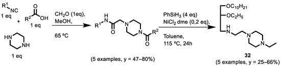 In 2022, Nichugovskiy et al. [133] demonstrated for the first time that the anticancer activity of lipophilic synthetic polyamines (LPAs) with fragments of piperazine is comparable to that of aliphatic LPAs. In their publication, they demonstrated a new method for the synthesis of LPAs using the N-split Ugi multicomponent reaction and subsequent reduction in amide groups by PhSiH3 (Scheme 15). The anticancer activity was evaluated in the A-549, MCF7 and HCT116 cancer cell lines.