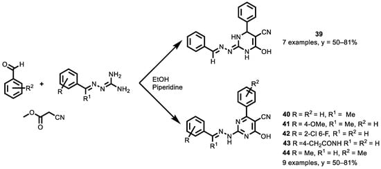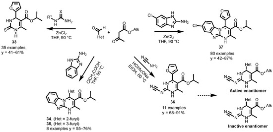 With the initiative to develop novel cancer immunotherapeutic agents via the modulation of the A2B adenosine receptor, Sotelo et al. [134,135,136,137,138] discovered several families of (monocyclic, bicyclic or tricyclic) pyrimidine derivatives (Scheme 16) that were readily and efficiently assembled through a three-component Biginelli reaction.