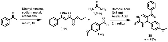 In 2021, a new ecofriendly Biginelli reaction procedure was adapted to prepare new dihydropyrimidines using β-aroylpyruvates as synthons [139]. All of the synthesized compounds were evaluated for their anticancer activity against 59 human cancer cell lines, representing different cancer types, including leukemia and melanoma, as well as lung, colon, ovarian, renal, prostate and breast cancer. The anticancer activity was demonstrated as a percentage growth inhibition of different human cell lines exerted by a single dose of 10−5 M. Compound 38 (Scheme 17) showed marked wide spectrum anticancer activity towards most of the tested cancer cell lines, with a percentage of growth inhibition of 29.04–71.68% upon a single dose administration (10−5 M). Specifically, most of the leukemia and colon cancer cell lines were highly sensitive to the antitumor effect of compound 38, with a growth inhibiting effect exceeding 50%, as well as the colon cancer HT29 cell line (53.16%) and the leukemia cell lines, K-562 (64.97%) and SR (71.68%).