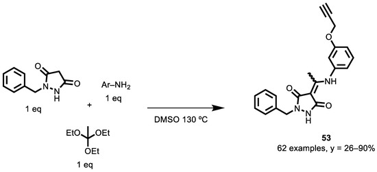 The Pauson–Khand reaction (PK-3CR) is also a versatile NIMCR, enabling the rapid assembly of α,β-cyclopentenones through [2 + 2 + 1] the cycloaddition of an alkyne, an alkene and carbon monoxide. For the generation of a diverse scaffold, other NIMCRs implemented are, namely, Pavarov-3CR, Dobener-3CR, Betti-3CR, and Petasis-3CR (Figure 4). For further information on NIMCRs chemistry, the reader is directed toward comprehensive review articles and other very interesting recent publications [89,90,92,93,103,104,105,106,107,108,109,110,111,112,113].