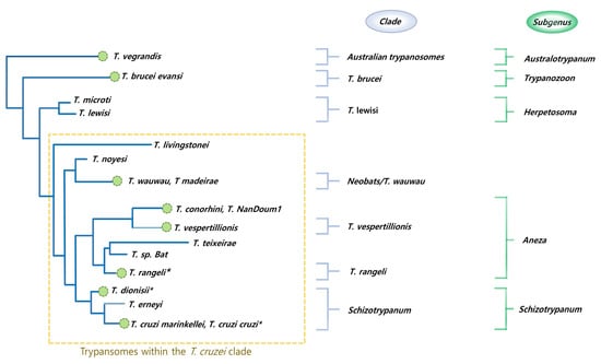 The phylogenetic relationships shared by bat trypanosomes and corresponding clade and subgenera nomenclature are represented. Zoonotic bat trypanosomes have an asterisk. Modified with permission [].