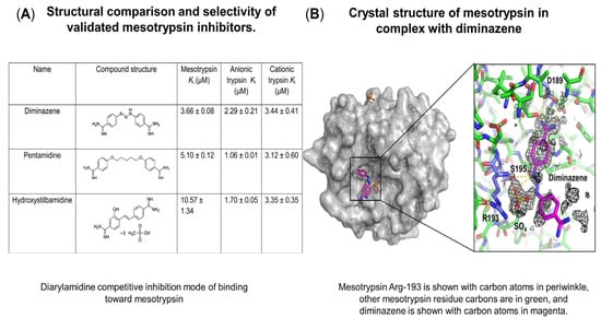 Small molecule inhibitors of mesotrypsin. (A) Competitive inhibition assay, all three compounds bind to mesotrypsin, with diminazene demonstrating the strongest affinity for the isoform. (B) Crystal structure of the diminazene mesotrypsin complex, interaction and specificity are mediated by Asp-189. Reproduced with permission [] Creative Commons Attribution License.