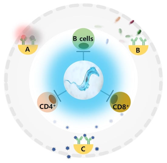 Parasitic impairment of B and T cells results in suppression of the adaptive response and specific antibody levels. (A) Decrease in specific antibody levels, increase in bacterial burden, exacerbation of disease severity, and the emergence of resistance to antimicrobials. (B) Diminished cellular humoral immunity and vaccine efficacy, possible breakthrough infection. (C) Protozoan modulated vaccine antibody response against different viral pathogens; impact on breakthrough infections inconclusive. Adapted from Akoolo et al. [].