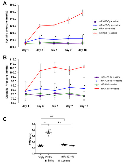 2.4. miR-423-5p Ameliorated Cocaine-Induced Increases in BP and Aortic Stiffness In Vivo