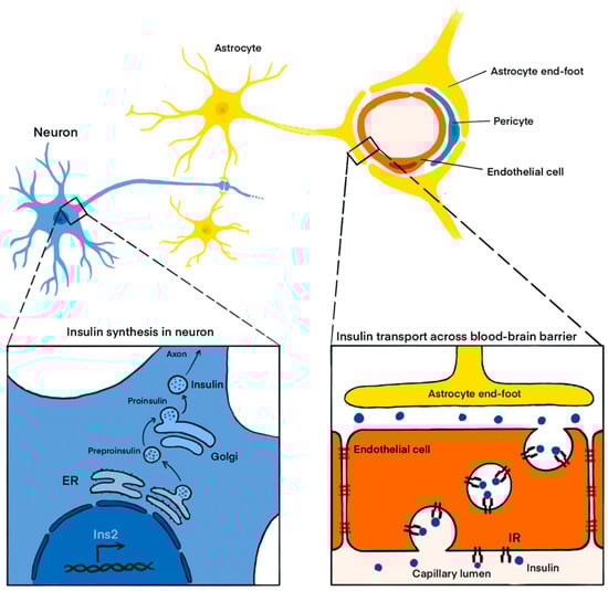 Insulin expression and presence in the central nervous system. Insulin synthesized in the pancreas is secreted into the systemic circulation and transported to the brain across the blood-brain barrier by receptor-mediated transcytosis. In addition, insulin is synthesized in neurons. Ins2—insulin 2; IR—insulin receptor; ER—endoplasmic reticulum.