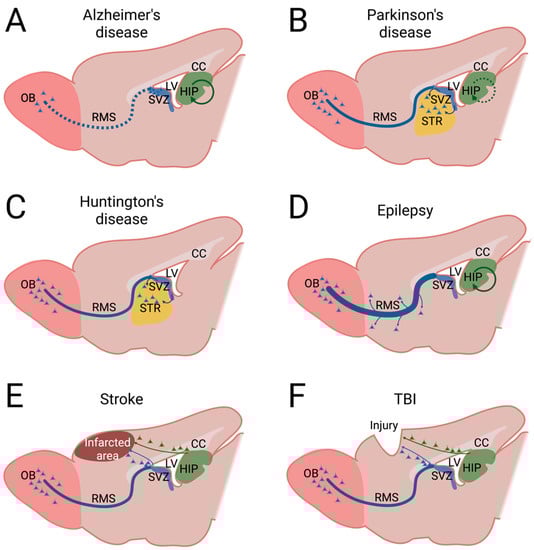 An association of alterations in neurogenesis in both niches with cognitive impairment has been described in mouse models of metabolic alterations [,,], cerebrovascular damage [], aging [], and neurological disorders [,] and in general, increased organized, non-aberrant neurogenesis leads to improved cognitive performance. In addition to the generation of neuroblasts and their maturation, post-neurogenic migration is another mechanism that undergoes significant changes during different disease processes. However, more extensive studies are required to properly understand the migration mechanisms and their role in different neurological disorders. Neurodegenerative diseases such as Parkinson’s disease (PD), Alzheimer’s disease (AD), or Huntington’s disease (HD) have a deep impact on brain configuration, even modifying the anatomical structure and its associated physiological conditions. These structural modifications could be observed also in stroke and trauma. The neuronal loss generates distinctive consequences, including decreased cognitive function, impaired attention, and even personality alterations [,]. In order to find strategies to compensate this neuronal loss, researchers worldwide have contributed to the understanding of the neurogenic processes, including migration, as well as the intrinsic characteristics of the neurogenic niches, which play a key role in neurogenesis as they harbor the NSCs from which new neurons derive.