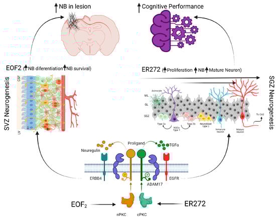 Effects of diterpenes on adult neurogenesis and its functional implications. In the bottom, it is represented how the different diterpenes act on their kinase targets, initiating the PKC-ADAM17 signaling pathways. In the top is represented its effects on SVZ and hippocampal neurogenesis and its potential benefits. EOF2 activates nPKC, which mainly induces neuregulin release and promotes neuroblast differentiation and migration to the injured areas. ER272 activates cPKC, which induces TFGα release and active hippocampal neurogenesis, improving cognitive performance. ADAM17, tumor necrosis factor-α-converting enzyme; CSF, cerebrospinal fluid; EC, ependymal cells; EGFR, epidermal growth factor receptor 1; GL, granular layer; ML, molecular layer; LV, lateral ventricle; NB, neuroblast; NSCs, neural stem cells; cPKC, classical protein kinase C; nPKC, novel protein kinase C; SVZ, subventricular zone; SGZ, subgranular zone; TFGα, transforming growth factor alpha. Created with BioRender.