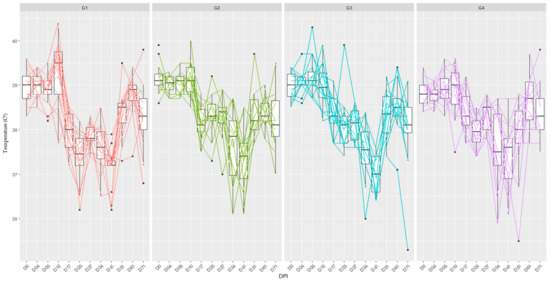 Parallel coordinate boxplots of rectal temperature measurements (°C) recorded over time considering animals from G1 to G4. The lines in a parallel coordinates plot represent the trajectories of observations across different time points. The bold dots indicate the outliers.