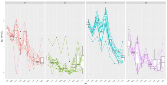 Regarding IgA, on D3, D41, and D51, no differences were recorded between the medians of the groups by the non-parametric Kruskal–Wallis test (p = 0.31). At D10, the S/P value was lower in G2 and G4 when compared to G1 and G3. On D17, the median of G4 was higher when compared to G1 and G2. On D31, G3 was higher than G4. On D61, the smallest measure was G3 when compared to the others. On D71, the median S/P was higher in G4 than in G3, while G1 and G2 did not differ from the others by the Kruskal–Wallis test at p < 0.05 (Table S5).