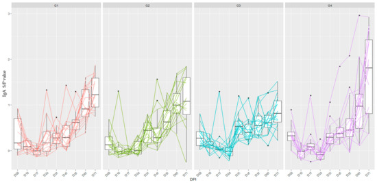 Parallel coordinates boxplots of S/P values for IgA anti-M. hyopneumoniae recorded over time considering animals from G1 to G4. The lines in a parallel coordinates plot represent the trajectories of observations across different time points. The bold dots indicate the outliers.