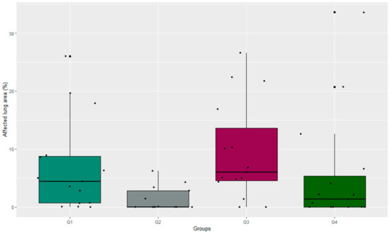 The lungs of the piglets in each group were evaluated individually, recording the degree of consolidation lesions in each lobe so that the total affected area could be calculated (Figure 4). Regarding the extension of macroscopic lung lesions (%), a difference was observed between G2 and G3. Significant differences were observed between G2 and G3 (p = 0.005), and a trend towards significance was noted between G4 and G3 (p = 0.07) (Table 2).