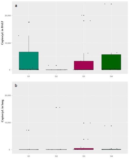 Boxplot with Mhyo quantification values in tracheobronchial and lung lavage samples for groups from G1 to G4 (a,b). The light dots represent each observation. The bold dots, centered on the boxplot, indicate the outliers.