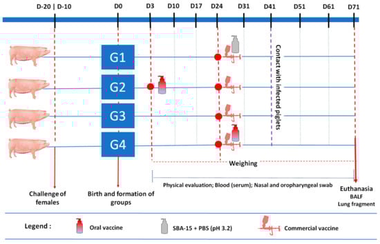 Before the collection of samples and the definition of the formulations that each group would receive, all animals, from G1 to G4, were weighed, their temperature was measured, nasal swabs and blood were collected, and they were identified with earrings, defining a total of 15 piglets per group. The drawing of formulations among the different litters was carried out in the R Project software version 4.0.3 using the “sample” function. The vaccination protocols were randomly defined to each group as follows: G1: oral SBA15 + commercial vaccine at 24 days, G2: oral vaccine on the third day + commercial vaccine at 24 days, G3: commercial vaccine at 24 days, and G4: commercial vaccine + oral vaccine at 24 days.