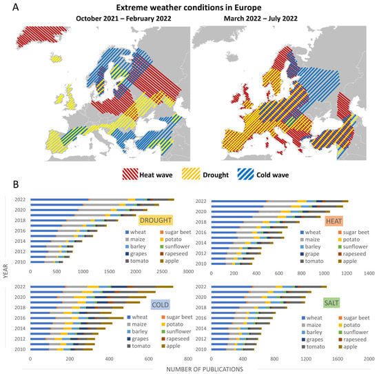 Locations of recorded extreme weather conditions in Europe and the number of published works focusing on abiotic stress in crops. (A) Weather conditions recorded by the German Weather Service from October 2021 to February 2022 and March 2022 to July 2022 (Deutscher Wetterdienst, 2022, [15]). The heat or cold wave is a period of at least one week with temperature anomalies (exceeding +6 °C over or −6 °C below the average temperature during the reference period 1981–2010). Panel 1A was adapted from an original map image made by Maix, Wikimedia Commons, distributed under a CC SA 3.0 License. (B) The number of publications focusing on a specific crop and abiotic stress in the last 13 years. The data were obtained from the Clarivate Web of Science database based on the methodology detailed in Supplementary Materials S1.