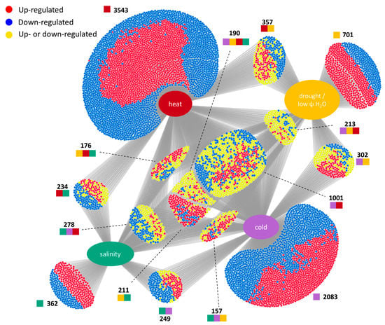 Meta-analyses are efficient approaches to the identification of important genes in abiotic stress responses. Recently, these bioinformatic analyses uncovered important abiotic stress targets in soya, wheat, and rice [200,201,202]. The results of the transcriptomic studies, which are available in the Expression Atlas database, provide a rich resource that allows analyses and comparisons of the effects of different stressors [203]. Here, we focus on the common regulation of genes significantly modulated by drought (or low water potential), heat, cold, or salinity. A total of 10,317 genes were found to be regulated by at least one stress condition, which at least doubled a gene’s expression (Figure 4).