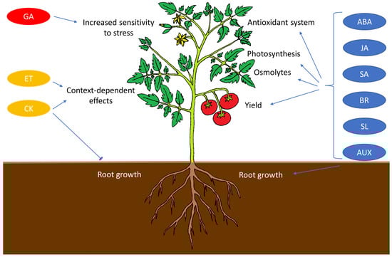 - Yuan, G.-F.; Jia, C.-G.; Li, Z.; Sun, B.; Zhang, L.-P.; Liu, N.; Wang, Q.-M. Effect of Brassinosteroids on Drought Resistance and Abscisic Acid Concentration in Tomato under Water Stress. Sci. Hortic. 2010, 126, 103–108. [Google Scholar] [CrossRef]