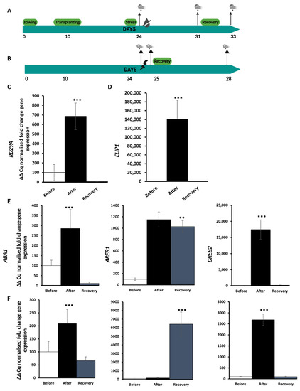 Plants were subjected to D or HL stress as indicated and, to verify the unfolding of a proper stress response, the expression of two different markers, Responsive to Desiccation 29A, RD29A gene [26] and Early Light Induced Protein 1, ELIP1 [27] for D and HL stress, respectively, were measured at the three time points (before, after, and recovery) as indicated in Figure 1C,D. The two markers were chosen because they have been routinely used in previous HL and D experiments [28,29]. In our experimental set up, RD29A expression increased significantly upon D stress and decreased after 3 days of rewatering (recovery), as outlined in Figure 1C. Similarly, to D stress, ELIP1 expression increased significantly upon HL treatment and decreased after recovery (Figure 1D). This indicates that both D and HL elicit a transient stress response in our experimental conditions.