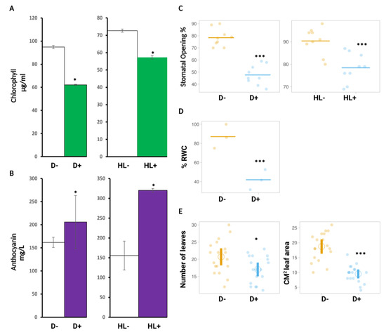 D and HL affect chlorophyll content, anthocyanin, stomatal opening, relative water content, and leaf growth. (A) Total chlorophyll from WT leaves after D stress treatment (left) (D- no D stress/control and D+ = D stressed), and after HL stress treatment (right) (HL- = no HL stress/control and HL+ = HL stressed). (B) Anthocyanin content from WT after D and HL stress treatment. (C) Percentage of stomatal opening in WT after D and HL stress. (D) RWC (%) in WT after D stress. (E) Total number of leaves and leaf area after D stress measured by image J software 1.52A. Data are a representation of three biological replicates (n = 3) with mean values. Statistical significance analyzed by t-test, *** p < 0.001, * p < 0.05.
