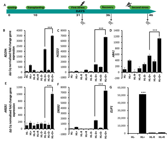 Once verified the effectiveness of the single stress both at the molecular and physiological level, we assessed the effect of HL stress on plant response to a subsequent D stress by setting up a sequential stress experiment. Briefly, plants were treated with HL (priming stimulus), underwent a five-day recovery period, and were then subjected to D stress (triggering stimulus) to identify if the response initiated by HL can prime a tolerance against a subsequent D stress (Figure 3A).