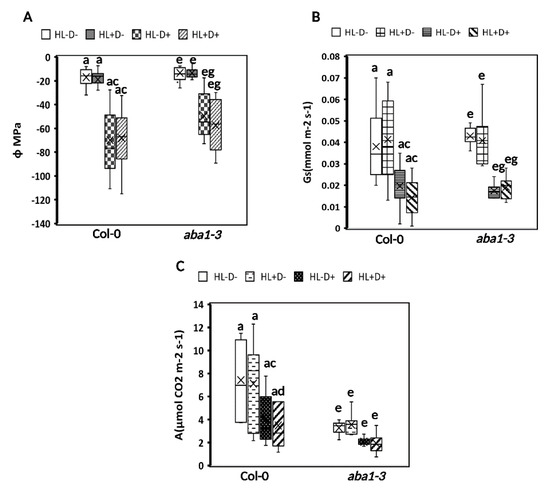 The phytohormone abscisic acid (ABA) regulates the adaptive responses of plants to various environmental stresses and diverse physiological and developmental processes. One of the foremost functions of ABA is indeed the regulation of water and osmotic balance in plants. For instance, ABA is abruptly synthesized to regulate the closing of stomata in response to D. Additionally, activated ABA signaling enhances D stress-responsive genes; however, some D stress-responsive genes are independent of ABA [20,21,22]. Few studies have indicated that plants may become acclimated to HL through ABA signaling [16,23]. For instance, in Arabidopsis, HL-exposed plants showed a two-fold increase in ABA levels compared to plants grown under normal light conditions [16]. Additionally, a phenotypic analysis showed that the ABA biosynthesis-defective mutant nced3nced5 was hypersensitive to HL compared to the wild type [16]. The induction of the ABA pathway upon both stresses suggests that D and HL might share some of the downstream components involved in a molecular network of plant response to these two stresses.