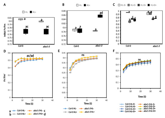 In conclusion, there was no evidence of a priming effect on photosynthetic parameters. Plants responded to HL treatment with an expected transient reduction in Fv/Fm that recovered post-stress. Drought stress led to a small but significant reduction in Fv/Fm but not the light-adapted parameters (Fv′/Fm′, NPQ, and Fq′/Fm′). Pre-treatment of HL did not impact on subsequent drought stress performance of the plants, irrespective of the ability to increase ABA levels. This suggests HL treatment may not result in physiological priming.