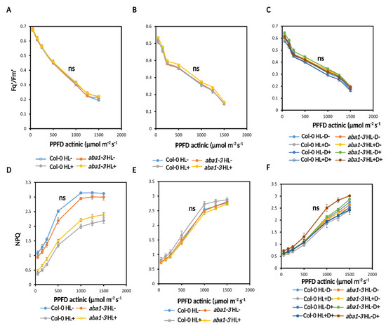 We also measured a light response curve ranging from 1500–50 µmol m−2 s−1 PPFD to quantify the operating efficiency of PSII (Fq′/Fm′) and non-photochemical quenching (NPQ). No changes were seen between treatments in Fq′/Fm′ at HL, recovery, and D for WT and aba1–3 (Figure 7A–C and Figure S11). WT and aba1–3 plants had significantly higher NPQ under low light conditions compared to HL-treated plants. After recovery and post-D stress, there was no significant difference between genotypes or treatments (Figure 7D–F).