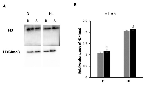 To identify if there were any changes in chromatin organization, specifically histone modification upon D and HL stress independently, we extracted histones from plant rosettes immediately before (B) and after (A) D and HL stress. H3K4me3 is a good marker of stress memory and gene activation [39,40]; therefore, we selected this histone marker. Immunoblotting analysis of histone extracts collected from before and after D and HL samples separately were assessed from blots with the Bio-Rad Image Lab Software 5.1. The histone mark was increased after both stresses compared to the before samples, thus suggesting that the stresses were the cause of the increased level (Figure 8). The difference in the enrichment of the mark (B versus A) is similar between the two stresses. However, from the HL experiment, the plants seem to yield slightly more H3K4me3 in their samples compared to the D experiment.