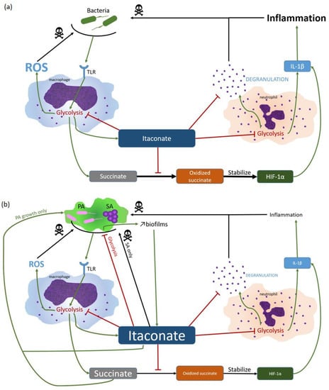Itaconate hijacking by SA and PA. (a) In normal circumstances, SA and PA are detected by TLR, leading to macrophage activation and inflammation induction via succinate oxidation. In order to modulate pro-inflammatory responses, itaconate is synthetized. Itaconate inhibits glycolysis, succinate oxidation and neutrophils degranulation, drastically reducing inflammation and protecting host cells. (b) During chronic infections, SA and PA are able to adapt and hijack host response. Despite bacterial glycolysis inhibition, itaconate induces PA growth by succinate accumulation which is used as energy source. Secondarily, itaconate leads to more EPS synthesis, enabling more biofilm formation, which in turn induces itaconate production, promoting SA PA persistency.