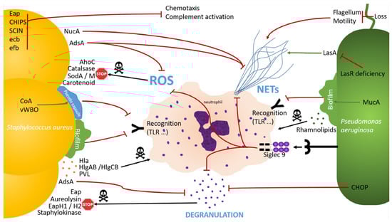 SA and PA are able to escape neutrophil recognition by biofilm (MucA) and pseudo capsule formation (CoA, vWBO). They are able to inhibit ROS production (Siglec 9 binding, AdsA) and to limit ROS effect (AhoC, catalase, SodA, SodM, carotenoid). SA and PA also have the ability to inhibit neutrophil degranulation (Siglec 9 binding, AdsA, CHOP) and to block neutrophils products activity (eap, aureolysin, EapH1, EapH2, staphylokinase). Finally, SA and PA are able to inhibit NETs formation (Siglec 9 binding, loss of flagellum/motility, LasR deficiency, NucA, AdsA). SA and PA may impair neutrophil response by inducing neutrophils death (γ hemolysin, PVL, rhamnolipids). Moreover, SA is able to inhibit chemotaxis and complement activation (Eap, CHIPS, SCIN, ecb, efb).