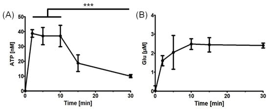 Then, in order to validate the research model, the dynamics of ATP and Glu release were investigated without the tested gut metabolites addition. The release of ATP and Glu from the astrocyte culture was found to be time-dependent. ATP was released rapidly [], with maximum extracellular concentrations reached at 2–10 min, and with the significant decrease afterwards likely due to the action of ectonucleotidases []. On the other hand, extracellular Glu accumulated during the first 10 min and appeared not to decrease later on (Figure 1).