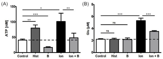 Effect of 10-min treatment with positive controls (histamine 100 μM and ionomycin 5 μM) and a negative control (BAPTA-AM 50 μM 30-min pre-treatment) on (A) ATP and (B) Glu release from the astrocyte cultures. The effect of BAPTA-AM was tested in the presence and absence of ionomycin. The bars represent the mean estimates, whereas the whiskers indicate standard errors of means. Dashed lines indicate the level of ATP and Glu released in control conditions (fresh experimental medium or HEPES buffered Ca2+-containing solution, respectively). The number of biological replicates n ≥ 9 for each condition. One-way analysis of variance with post hoc Dunnett’s test, significance level α = 0.05. * p < 0.05, ** p < 0.01, *** p < 0.001. ns—not significant, Hist—histamine, B—BAPTA-AM, Ion—ionomycin, Ion + B—ionomycin following 30-min pre-incubation with BAPTA-AM.