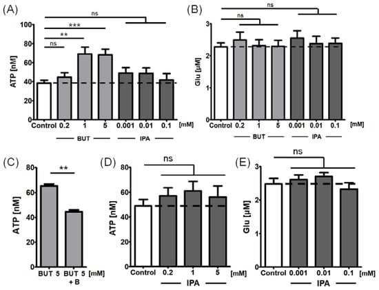 Effects of BUT and IPA on ATP and Glu release from the cultured astrocytes. (A) Effect on ATP release following 10-min treatment. (B) Effect on Glu release following 10-min treatment. (C) Attenuation of the BUT effect on ATP release by 30-min pre-incubation with BAPTA-AM 50 μM. (D) Effect on ATP release following 24-h pre-treatment with IPA. (E) Effect on Glu release following 24-h pre-treatment with IPA. The bars represent the mean estimates, whereas the whiskers indicate standard errors of means. Dashed lines indicate the levels of ATP and Glu release in control conditions (fresh experimental medium or HEPES buffered Ca2+-containing solution, respectively). Number of biological replicates n ≥ 9 for each condition. One-way analysis of variance with post hoc Dunnett’s test, significance level α = 0.05. ** p < 0.01, *** p < 0.001. ns—not significant, B—BAPTA-AM.