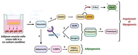 Seo et al. [] investigated this cross talk by co-culturing preadipocytes with murine muscle cells. Murine preadipocytes 3T3-L1 were cultured and differentiated on inserts for up to 10 days; then, inserts were placed in 24-well cell culture companion plates where murine myoblasts were seeded the day before starting co-culture. The co-culture was carried out for 5 days prior to analyses. The authors observed a paracrine cross talk between the two cell types, with downregulating effects of adipocytes on the differentiation of myoblasts mainly related to a downregulation in myogenin and upregulation in myostatin, atrophy-related ubiquitin E3 ligases (Atrogin1) and muscle RING-finger protein-1 (MurF-1) in muscle cells. Myogenin is a basic helix–loop–helix transcription factor that belongs to the myogenesis regulatory factors (MRFs) family. It is activated by the myoblast determination protein 1 (MyoD), and it plays a role in myocyte fusion and contractile protein synthesis during myogenesis [,,]. Myostatin, also known as growth differentiation factor 8 (GDF8), is an adipomyokine produced by muscle cells to counteract muscle growth by indirectly activating the protein mothers against decapentaplegic homolog 3 (Smad3), a key element in the transforming growth factor beta pathway which inhibits myogenesis [,,]. Smad3 binds to the basic helix–loop–helix (bHLH) region of MyoD so that MyoD cannot bind the DNA response element enhancer box (E-Box) CAXXTG and consequently cannot activate myogenin expression []. The myostatin pathway also leads to an overexpression of the ubiquitin–proteasome system [], in particular of atrophy-related ubiquitin E3 ligases (Atrogin1) and muscle RING-finger protein-1 (MurF-1) by binding the Activin type II receptor (ActRIIB) []. Atrogin1 and MuRF-1 are tissue-specific proteins, typically expressed and upregulated in the proteasome machinery during muscle wasting [,,]. They are responsible for the proteolysis that leads to muscle atrophy [,], a condition of skeletal muscle loss to which the main contributor is the ubiquitin–proteasome proteolytic system []. Moreover, Seo et al. detected an increased adipomyokine Interleukin-6 (IL-6) level in the murine C2C12 myoblasts. In the study, adipocyte-induced IL-6 played an inhibitory role in muscle cell differentiation [].