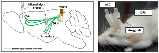 Illustration of the microdialysis imaging platform. (Left): serotonergic projection from the DRN to the CeA and the ACC. (Right): imaging device implantation in the left DRN and the microdialysis probes in the left CeA and the ACC.