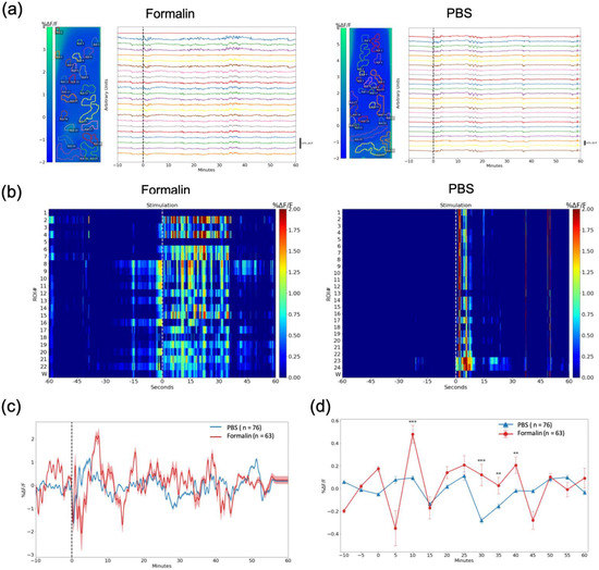 Calcium traces of specific regions of interest (ROIs). (a) ROIs in the formalin and the PBS groups; Left: ROIs, each color representing each ROI; Right: calcium traces for each selected ROIs. The device was implanted in the left DRN. (b) Representative heatmap showing fluorescence changes (ΔF/F0) 60 s before and after the injection of formalin and PBS; the number in this figure indicates ROI, and w refers to a whole image. The figure showed the difference in response of the DRN immediately after nociception. (c) Average fluorescence changes of G-CaMP6 after the intra-plantar injection of formalin and PBS (60 min). The dashed black line shows the injection (n = 63 ROIs in the formalin group, n = 76 ROIs in the PBS group). (d) Statistical analysis for the fluorescence activity in 5 min time-lapse. Data are presented as mean ± SEM, with the error bars or shaded region indicating the SEM. Statistical analyses were performed using Mann Whitney U tests. ** p < 0.01, and *** p < 0.001.