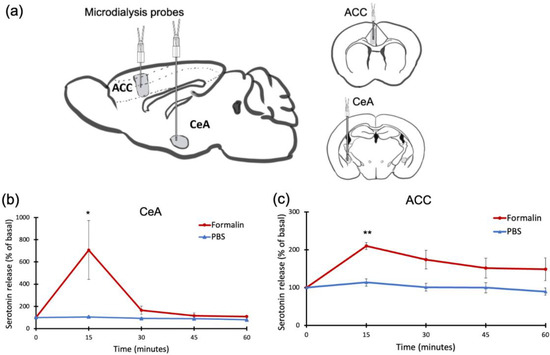 We implanted the device in the dorsal raphe nucleus (DRN), which contains more than half of the serotonergic cell body in the brain [18]. The DRN is located in the brain stem—specifically, in the ventral part of periaqueductal grey (PAG). Serotonin in the DRN is ascendingly projected to various brain regions, including the central nucleus of the amygdala (CeA) and the anterior cingulate cortex (ACC). The CeA in the limbic system is densely innervated by DRN serotonin neurons, is responsible for emotion [19], and is prominently perceived as a center for nociceptive-specific information. It plays a key role in pain [20], anxiety [21], and depressive disorder [22]. The ACC is also an essential area in the cortex that is actively involved in pain processing and chronification [23,24]. Therefore, in this research, we implanted microdialysis probes in the CeA and the ACC (Figure 1). We injected formalin into the mid plantar of the mouse’s hind paw, which is a widely used model for nociceptive pain [25,26].