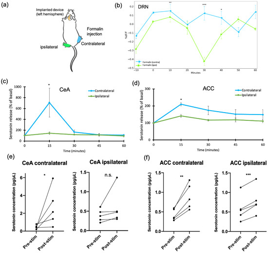 In this study, we implanted three devices in the left hemisphere. Then, we injected a solution (formalin or PBS) either into the right (contralateral) or the left (ipsilateral) hind paw (Figure 5a). We tested the response of the DRN, the CeA, and the ACC after formalin injection. A statistically significant difference in the fluorescence intensity of the DRN was found between contralateral and ipsilateral stimulation at certain time points (Figure 5b). These time points were in the acute phase at 10 min after the injection (p < 0.01), and during the inflammatory phase at 30 min (p < 0.001) and 40 min (p < 0.05). Serotonin release in the CeA was also statistically different between contralateral and ipsilateral (p < 0.05) (Figure 5c). Serotonin concentration in the CeA increased compared to pre-stimulation only after contralateral injection. In contrast, serotonin release before and after the injection in ipsilateral stimulation was not statistically different (Figure 5e).