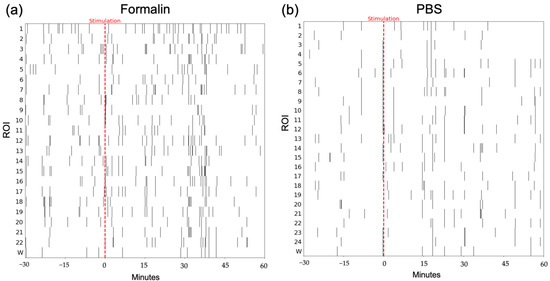 Representative peak raster plot of calcium traces. (a) Formalin group. (b) PBS group. The red dashed line indicates the stimulation. The x-axis shows the time (30 min before and 60 min after the injection), and the y-axis shows the ROIs; w refers to the whole frame.