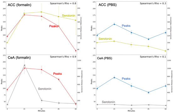 Correlation between calcium imaging peaks of the DRN and serotonin release in the CeA and the ACC using Spearman’s rank correlation test. The red line indicates DRN calcium peaks after formalin injection, the blue line indicates DRN calcium peaks after PBS injection, the gray line indicates serotonin release in the CeA, and the olive indicates serotonin release in the ACC.
