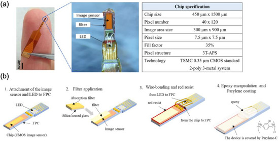 Our lab has developed an implantable micro-imaging device for rodents [13,14,15]. The needle type of this CMOS-based device allows us to observe neural activity in the deep brain region. The implantable imaging device structure consists of a CMOS image sensor and µLED embedded in a flexible printed circuit (FPC) (Taiyo Industrial Co. Ltd., Wakayama, Japan) (Figure 9a). We used a CMOS image sensor containing 40 × 120 pixels (7.5 μm per pixel). The imaging device has a long vertical view, allowing us to observe multiple layers at the same time. To excite GCaMP-expressing cells, we used a µLED with an emission wavelength of 473 nm (ES-VEBCM12A, Epistar, Hsinchu, Taiwan). The fabrication of this imaging device was performed through the following processes: (i) the attachment of the image sensor and µLED to the FPC, (ii) filter application to the image sensor, (iii) wire bonding and red resist application, and (iv) epoxy encapsulation and parylene coating (Figure 9b).