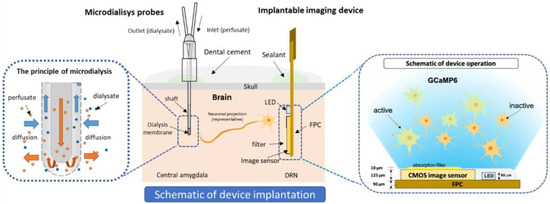 In previous studies, we have demonstrated the utilization of our novel imaging device for observing deep brain regions [14,15]. The core work of this study is to apply our imaging device for pain circuitry and combine it with microdialysis. This allows us to measure two proxies of brain activity: (1) calcium imaging fluorescence, and (2) neurotransmitter release. We focus the study on serotonin (5-hydroxytryptamine or 5-HT), a neurotransmitter that has a well-known correlation with the regulation of pain [16]. The depletion of serotonin can increase pain sensitivity [17]. Additionally, the serotonergic pathway is also currently used as a potential therapeutic target against some chronic pain problems.