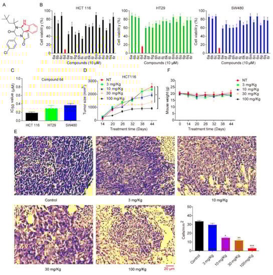 2.1. Spiroindoline Compound 6d, as an Effective Anticancer Inhibitor, Is Capable of Inhibiting CRC Cell Proliferation and Growth In Vitro Cell Model and In Vivo Xenograft Model