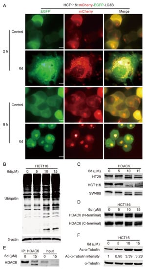 2.4. Compound 6d Blocks Autophagic Flux by Promoting Histone Deacetylase-6 (HDAC6) Cleavage