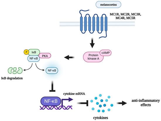 Mechanism of anti-inflammatory effects of melanocortins. MC1R: melanocortin 1 receptor; MC2R: melanocortin 2 receptor; MC3R: melanocortin 3 receptor; MC4R: melanocortin 4 receptor; MC5R: melanocortin 5 receptor; cAMP: cyclic adenosine monophosphate; PKA: protein kinase A; IκB: inhibitor of nuclear factor kappa B; NF-κB: nuclear factor kappa-light-chain-enhancer of activated B cells.