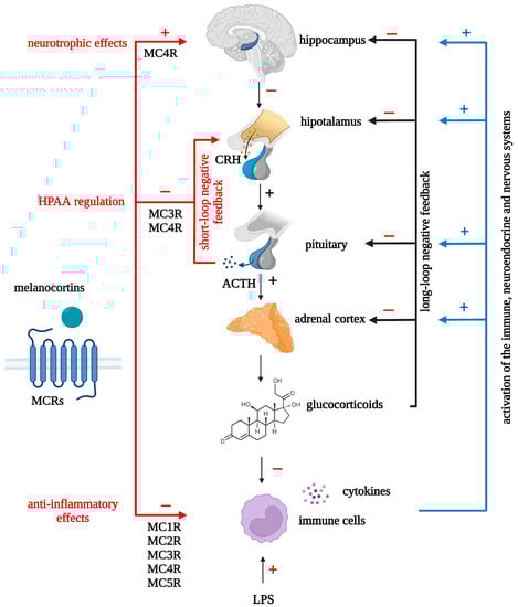 Therefore, the HPAA activity, both in inflammation and in its absence, can be regulated by melanocortins, including non-corticotropic ones. When administered centrally, MCRs agonists are activators of HPAA, but prevent its activation during central inflammation. When administered peripherally, melanocortin receptor agonists are able to inhibit HPAA activation induced by stress or systemic inflammation. This opens up the possibility of normalizing depression-associated HPAA hyperactivity with peripheral administration of melanocortins.