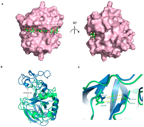The optimal docking result between DP6-chitosan and the binding site was obtained (Figure 3A). We found that the length of the binding site (about 27.5 Å) was roughly the same as that of DP6-chitosan, and the narrowest width (about 10.3 Å) was enough to allow chitosan to enter and interact with the surrounding residues. Moreover, the catalytic residues ASP143 and GLU152 were located almost at the center of the binding site, and the distance between their side chains was only about 6.0 Å (Figure 3C). If the glycosidic bond only moves to the middle of them, the enzymatic reaction can easily occur. Because members from the same family tend to be structurally similar, we aligned its structure with the experimental structure of V-Csn from the soil virus AMG [19]. Although their sequences are quite different, they still share a high similarity in overall structure, with the RMSD of only 1.33 Å. More importantly, their binding sites are not only similar in structure and size (Figure 3B), but also have almost the same positions and relative distances of catalytic residues (Figure 3C). This result demonstrates the accuracy of the predicted structures from both the geometric and evolutionary perspectives.