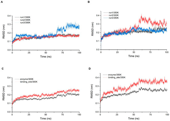 (A,B) The RMSD of the three simulations at 300 K and 350 K; (C,D) show the comparisons of the RMSD average values between the whole structure and binding site at each temperature.