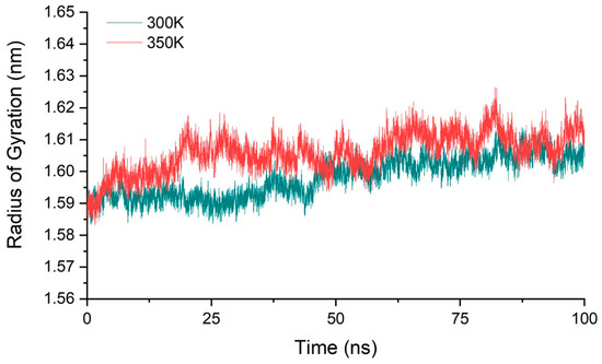 We calculated the molecular radius of gyration of chitosanase for three simulations at 300 K and 350 K, respectively, and their average value to ensure that all samples were fully considered (Figure 5). The result showed that the radius varied within 1.58–1.62 nm at both temperatures, with a range of only 0.04 nm. The mean value of the gyration radius at 350 K only increased by about 0.01 nm compared with 300 K, less than 1% compared with the radius scale of 1.6 nm. This showed that the overall structure of the enzyme is relatively stable during the heating process, and there was no tendency of protein denaturation such as looseness or swelling, so the conformational changes may only be located in a small part of the region. This also provides a good structural basis for the next step of enzyme modification.