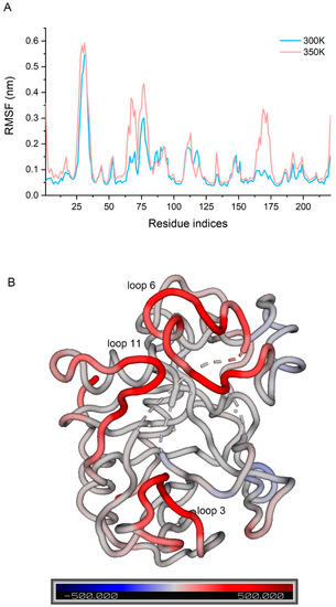 (A) RMSF of the concatenated trajectories at 300 K and 350 K; (B) difference in B-factor between 300 K and 350 K in the structure by spectrum.