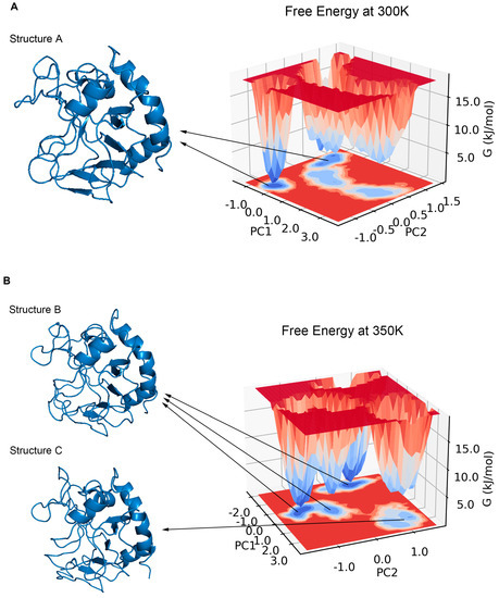 PCA has been shown to be able to identify and classify a large number of conformations in trajectories to help find the dominant structure [34]. We calculated the PCA for the trajectories at 300 K and 350 K, respectively. The results showed that the first two principal components could explain more than 55% of the molecular motion at 300 K and nearly 44% at 350 K. Plotting the free energy surface can help us search the lowest energy conformation [35]. In the free energy landscape (Figure 8), there was only one free energy basin at 300 K with a relative free energy of −13.419 KJ/mol, and the energy of the second minimal point was already 2 KJ/mol higher; the lowest valley at 350 K had a relative free energy of −18.492 KJ/mol, while there was another basin with a free energy only less than 0.05 KJ/mol higher. If one energy basin corresponds to multiple conformations, cluster analysis can be used to find the most dominant conformation among them [36,37]. We yielded seven and 10 structural clusters at 300 K and 350 K, respectively. The first cluster accounted for 78.8% of all samples in the trajectory at 300 K and 71.8% at 350 K, both being the dominant conformations in their respective environments (Figure A3). We also found the representative conformation of the main structural clusters corresponding to the minimum energy points (Figure 8): at 300 K, the deepest free energy basin in the landscape corresponded to the first structural cluster (structure A); at 350 K, the two deepest free energy basins were actually similar in terms of the overall structure, and together corresponded to the first structural cluster (structure B), while another basin with a higher free energy at a farther distance corresponded to the second structural cluster (structure C), accounting for 16%.